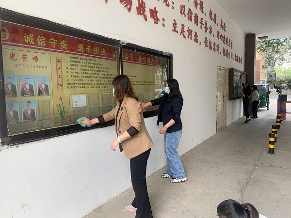 院內(nèi)整理清掃完畢后,大家又轉(zhuǎn)移陣地到辦公樓內(nèi),對(duì)辦公室、廁所、樓道等區(qū)域進(jìn)行了打掃。黨員們充分發(fā)揚(yáng)“甩開膀子、挑起擔(dān)子”的精神,擦拭玻璃、打掃地面、清理垃圾,全方位消毒噴殺,每一步都認(rèn)真到位,不留死角。經(jīng)過近三個(gè)小時(shí)的辛勤勞動(dòng),院里綠化帶的枯枝、雜草得到了整治,機(jī)關(guān)大院內(nèi)更加整潔美觀,環(huán)境煥然一新。機(jī)關(guān)辦公室窗明幾凈、一塵不染,所有衛(wèi)生死角被徹底清理。大家擦擦汗水,露出會(huì)心的微笑。