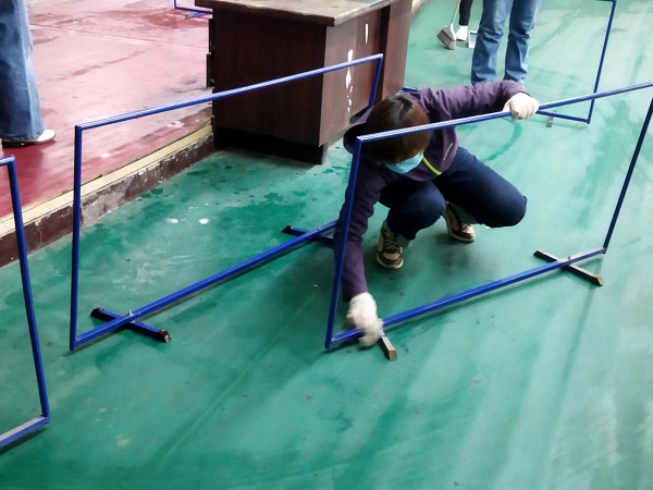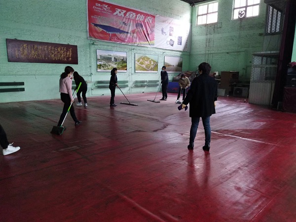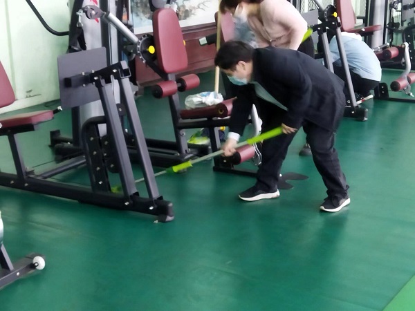 參與活動(dòng)的20余名同志,分工合作,雖然大家來(lái)自不同部門、不同崗位,但爭(zhēng)先恐后、合作默契,清理地面、擦拭健身器材、清潔桌凳?!扒懊娴哪型緜兗佑土?,我們快趕上你們了!”負(fù)責(zé)拖地的九分公司主任經(jīng)濟(jì)師劉彩在后面說(shuō)道。“這個(gè)乒乓球擋布拿抹布擦拭的效果不太好,用外面的高壓水槍沖洗試試吧!”九分公司主任會(huì)計(jì)師付世芳一邊用抹布擦拭擋布一邊提出自己的合理化建議,“這個(gè)辦法好!”九分公司綜合辦公室主任張路平同意道。