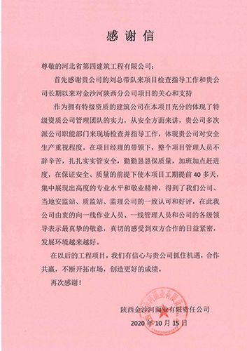 10月22日,四分公司收到陜西金沙河項(xiàng)目部業(yè)主單位致公司的感謝信和錦旗,以及武功縣住房和城鄉(xiāng)建設(shè)局、監(jiān)理單位贈送的錦旗。