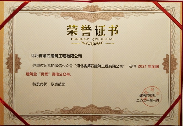 7月16日,在“2021建筑業(yè)微信公眾號運維經驗交流研討會暨全國建筑業(yè)優(yōu)秀公眾號頒獎典禮”上,公司微信公眾號“河北省第四建筑工程有限公司”被評為“2021年全國建筑業(yè)優(yōu)秀微信公眾號”。