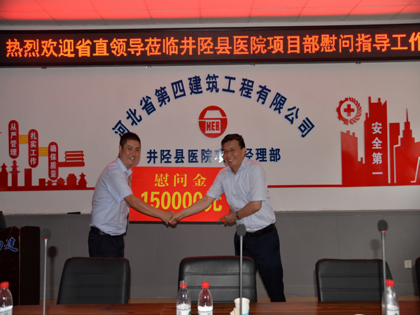 7月26日下午,河北省直工委副書記范金龍一行到二分公司井陘縣醫(yī)院項(xiàng)目部,對(duì)奮戰(zhàn)在一線的職工進(jìn)行暑期慰問,為他們送來了慰問金和慰問品。集團(tuán)工會(huì)主席王文利、公司黨委副書記、紀(jì)委書記、工會(huì)主席李懷生、二分公司黨總支書記孫立鋒一同參加。