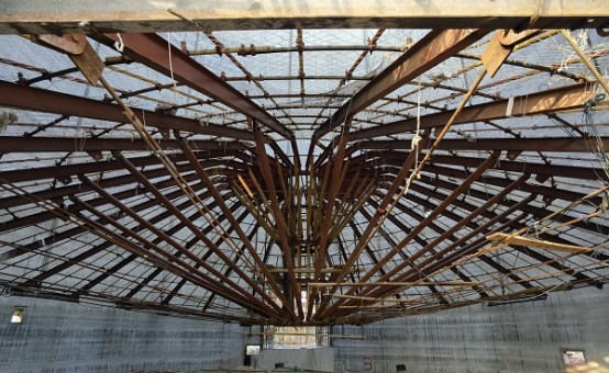 體系設(shè)計優(yōu)化,拼裝提速?!颁摻罨炷镣矀}錐殼頂板架空支撐施工工法”依托糧食類筒倉工程,筒倉建筑高度高達(dá)50米,內(nèi)徑26米,倉頂設(shè)計為錐殼頂、平頂雙層結(jié)構(gòu),斜錐殼板厚0.2米。以往筒倉倉壁一般采用滑模施工,錐殼頂板施工復(fù)雜,一般采用H型鋼組裝成圓柱形核心筒、外輻射鋼桁架平梁的方式組裝成支撐平臺,重21.9噸,用鋼量大,制作成本高;節(jié)點(diǎn)連接采用焊接,拼裝速度慢,無法滿足群體筒倉的周轉(zhuǎn)時效。分公司針對傳統(tǒng)做法的弊端,組織科研小組,專項(xiàng)研究,破解難題,最終形成了空間鋼桁架——拉索組合結(jié)構(gòu)支撐體系。該體系摒棄了3.2米直徑的圓柱型核心筒,采用直徑2.6米的傘狀中心筒,通過五道環(huán)梁環(huán)向拉接,無需設(shè)置斜撐,原結(jié)構(gòu)減輕將近1噸,節(jié)約了制作成本,而且承壓能力更強(qiáng)。重點(diǎn)節(jié)點(diǎn)還改用了高強(qiáng)螺栓連接代替焊接,拼裝速度明顯提升,施工速度更快。