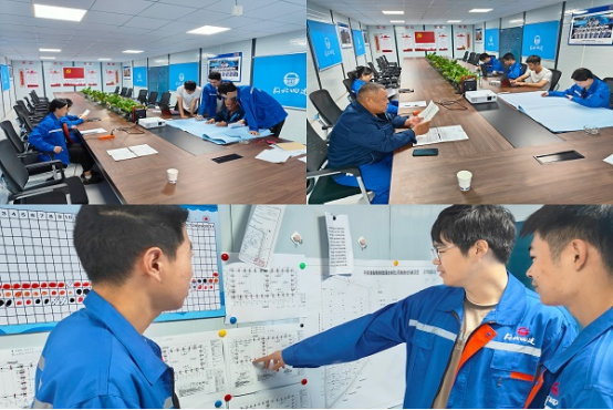 夜晚,成員們針對設(shè)計圖紙與現(xiàn)場施工軸線不一致的情況,通過互聯(lián)網(wǎng)進(jìn)行學(xué)習(xí),使用 GPS 為平房倉軸線定位。在工地上,成員們按照圖紙內(nèi)容嚴(yán)格執(zhí)行地梁箍筋間距、樁頂標(biāo)高等的規(guī)范要求,遇到不明白的地方就向工地上的老師傅請教,共同探討。他們將所學(xué)內(nèi)容與實際工作緊密結(jié)合,形成學(xué)和用的良性閉環(huán)。每周三晚上的問題交流會,以“互動式、聊天式”的學(xué)習(xí)方法,調(diào)動成員學(xué)習(xí)興趣和熱情。大家集思廣益,解決實際問題,激發(fā)創(chuàng)新思維和工作熱情。