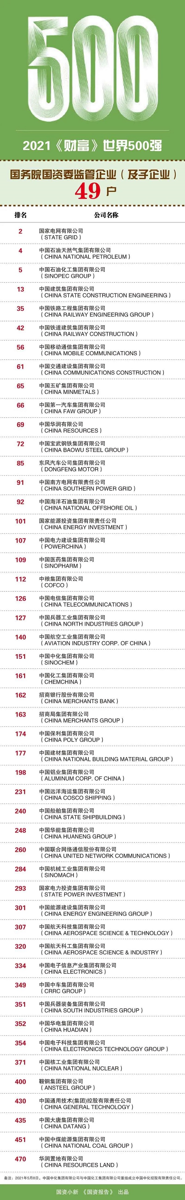 2021年度國(guó)務(wù)院國(guó)資委監(jiān)管的49家入圍世界500強(qiáng)的中央企業(yè)(及子企業(yè))完整名單